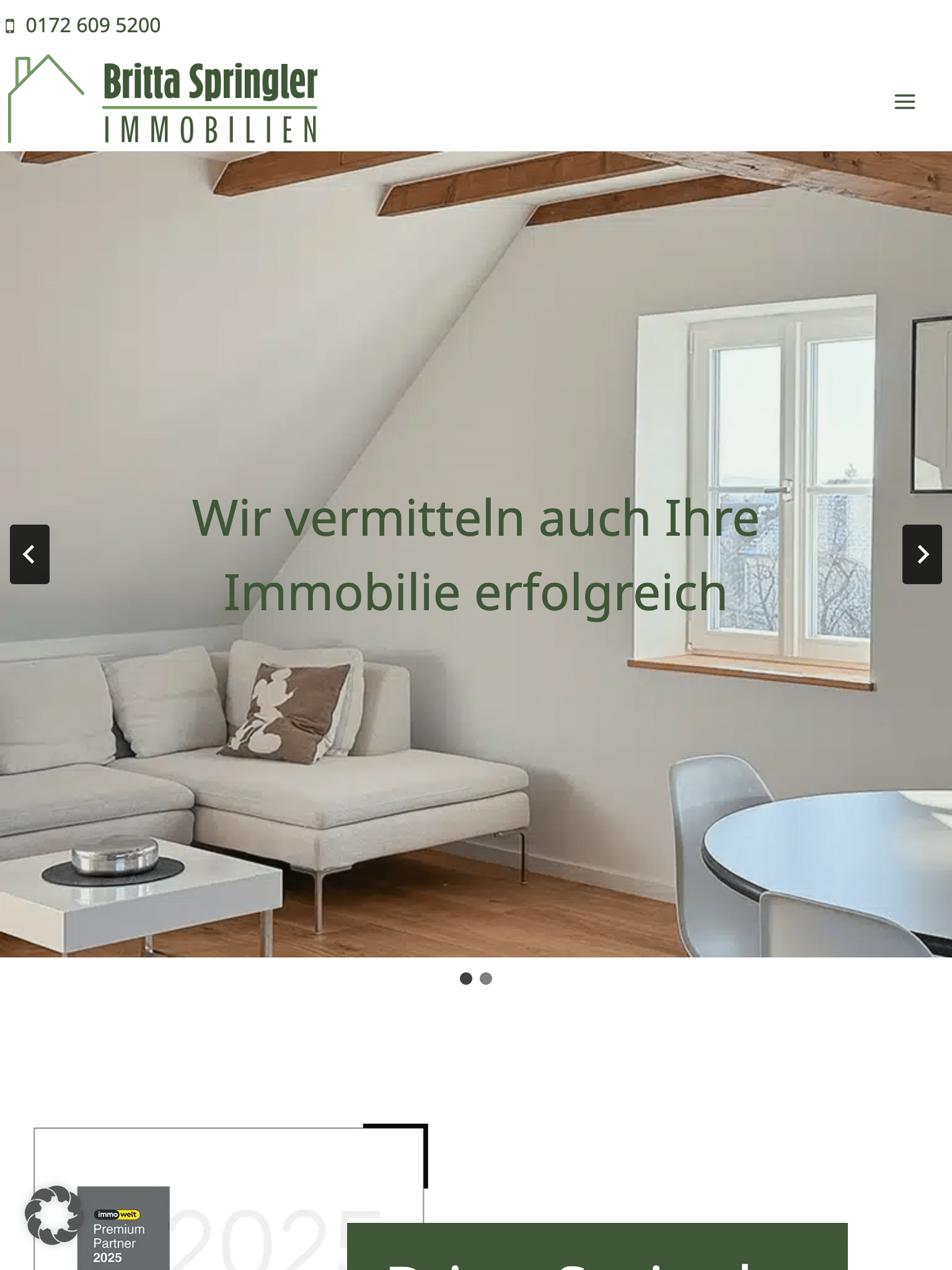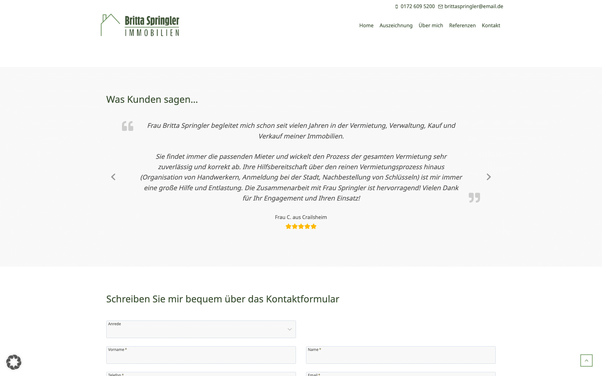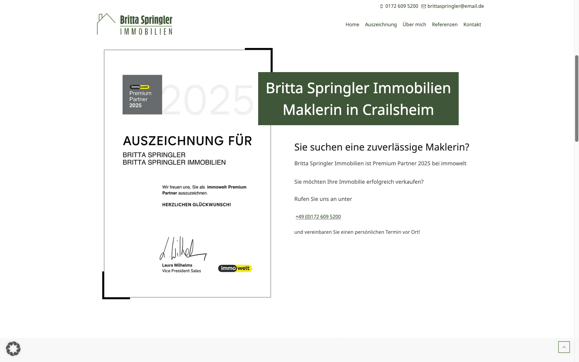 Wir haben für Britta Springler Immobilien in Crailsheim eine moderne, suchmaschinenoptimierte Webseite mit responsivem Design und schneller Ladezeit erstellt.